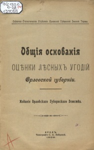 Оцѣночно-Статистическое Отдѣленіе Орловской Губернской Земской Управы. Общіяосхобахія ОЦѢНКИ ЛѢСНЫХЪ УГОДІЙ ©рловской губерніи. Изданіе Эрлобскаго Туберхскаго Земсшба. О Р Е Л Ъ . Типографія С. А. Зайцевой.