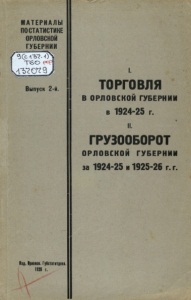 МАТ ЕРИАЛЫ ПОСТАТИСТИКЕ ОРЛОВСКОЙ ГУБЕРНИИ 4 ' £>?• т е О ^ П Н ЛЪ70Ч 9 / Выпуск 2-й. I. ТОРГОВЛЯ В ОРЛОВСКОЙ ГУБЕРНИН в 1924-25 г. ГРУЗООБОРОТ ОРЛОВСКОЙ ГУБЕРНИИ за 1924-25 и 1925-26 г. г. Над. IpiOBCR. Губстатвтдела. 1921 г.