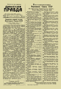 Пролетарии всех стран, соединяйтесь! а о н е к я я ПРСШДЙ Орган Донского райкома КПС и районного Совета депутатов трудящихся Липецкой области Гад изд. 24-й №ЗЭ~2218)~ Пятница, 4 апреля 1958 года. Цена 15 коп. Закрытие первой сессии Верховного Совета СССР Совместное заседание Совета Союза и Совету Национальностей В три часа дня 31 мйрта в Большом Кремлевском дворце открылось совместное заседа ние СОВЕТАСОЮЗА И*СОВЕ ТА НАЦИОНАЛЬНОСТЕЙ Вер ховного Совета СССР. За столом председателя— Председатель Совета Союза депутат П. П. ЛОБАНОВ, Пред седатель Совета Националь ностей депутат Я. В. ПЕЙВЕ, заместители председателей па лат. В ложах—товарищи А. Б. АРИСТОВ, Н. И. БЕЛЯЕВ, Л. И. БРЕЖНЕВ, Н. А. БУЛ ГАНИН, К. Е. ВОРОШИЛОВ, Н. Г. ИГНАТОВ, А. И. КИРИ ЧЕНКО, Ф. Р. КОЗЛОВ, 0. В, КУУСИНЕН, А. И. МИКЯОН, Н. А. МУХИТДИНОВМ,. А. СУСЛОВ, Е. А. ФУРЦЕ- ВА, Н. С. ХРУЩЕВ, Н. М. ШВЕРНИК, П. Н. ПОСПЕЛОВ, Д. С. КОРОТЧЕНКО, Я. Э. КАЛНБЕРЗИН, А. П. КИРИ ЛЕНКО, А. Н. КОСЫГИН, К.Т. МАЗУРОВ, В. П. МЖАВАНАД ЗЕ, члены Президиума Верхов ного Совета СССР. Депутаты и гости встретили их бурными аплодисментами. С заключительным словом по вопросу «О дальнейшем развитии колхозного строя и реорганизации машинно-трак торных станций» выступил Первый секретарь ЦК КПСС, Председатель Совета Минист ров СССР тов. Н. С. ХРУЩЕВ. От имени Комиссий законо дательных предположений обе их палат Председатель Комис сии законодательных предпо ложений Совета Союза депу тат Д. С. ПОЛЯСНКИЙ пред ставляет на рассмотрение де путатов проект Закома одаль нейшем развитии колхозного строя и реорганизации машин но-тракторных станций. Вер ховный Совет единогласно принимает этот Закон. Затем сесспя переходит к следующему вопросу повест ки дня—образованию Пра вительства СССР. Слово предоставляется Пред седателю Совета Министров СС Р депутату Н. С. ХРУЩЕ ВУ. Он вносит на утвержде ние сессии состав Совета Ми нистров СССР, одобренный Центральным Комитетом пар тии. Верховный Совет едино гласно утверждает Правитель ство СССР—Совет Министров Союза Советских Социалисти ческих Республик. Сессия рассматривает воп рос—«О прекращении испыта ний атомного и водородного оружия», Сзаявлением от име ни Советского правительства по этому вопросу выступил Министр иностранных дел СССР депутат А.А. ГРОМЫКО. В прениях по этому вопросу выступили токарь Ленинград ского завода «Электросила» депутат Н. И. ПЕРШИН, ака демик депутат Й. В. КУРЧА ТОВ, депутат Г. Е. БУРКАЦ- КАЯ, председатель ВЦСПС де путат В. В. ГРИШИН, писатель депутат Л. М.ЛЕОНОВ(РСФСР), депутат 3. РАХИМБАБАЕВА (Узбекская ССР)В.се выступав шие единодушно поддержали заявление Советского прави тельства об одностороннем прекращении испытаний атом ного и водородного оружия. . Верховный Совет единоглас но принимает Постановление по вопросу об одностороннем превращении Советским Сою зом испытаний атомного и во дородного оружия. Затем при нимается Обращение к Кон грессу Соединенных Штатов Америки по вопросу о пре вращении испытаний ядерного оружия. Аналогичные обраще ния принимаются также к Парламенту Великобритании, к парламентам всех стран мира. Принимается обращение к бундестагу Федеративной Республики Германии. Сессия принимает далее Постановление Верховного Со вета СССР—поручить Предсе дателям Совета Союза и Сове та Национальностей обратить ся к парламентам государств —участников антиг