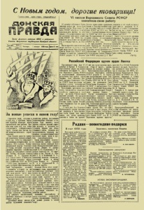 С Новым годом , дорогие товарищи! Пролетарии всех стран, соединяйтесь! аонскяя Орган Донского райкома КПСС и районного Совета депутатов трудящихся Липецкой области Год изд. ?5 й Г&331) Четверг, 1 января 1959 года. Цена 15 коп. За новые успехи в новом году! Советские люди, вступая в новый.год, с чувством закон ной гордости подводят итоги проделанной ими работы. Про шел еще один год, год .само отверженного созидательного труда, сделан еще шаг на пу ти коммунистического строи тельства. Еще больше радости прине сет советскому человеку новый, 1959 год. Этот год открывает ся всемирно-историческим со бытием—XXI съездом Комму нистической партии Советско го Сокш , который определит развитие народного хозяйства страны на ближайшее семиле тие. Сейчас, обсуждая тезисы доклада Н. С. Хрущева на XXI съезде КПСС о контроль ных цифрах развития народ ного хозяйства СССР на 1959 — 1905 годы, трудящиеся го рячо одобряют намечаемые пар тией мероприятия, акзивно н слагаются в борьбу за их досрочное выполнение, с каж дым днем растет число кол лективов, решивших жить и трудиться по-коммунзсткческв. , Высоких трудовых показате лей добились и многие коллек тивы нашего района. Рабочие Донского рудника.спиртсовхоз- комбината «Тихий Дон», же лезнодорожных станций не только досрочно справились со своими годовыми заданиями, но и. добились значительной экономии денежных и матери альных средств. Достойный вклад внесли и многие труженики сельского хозяйства района. Колхозники сельхозартели «Рассвет» в те кущем году намного выше других собрали урожай зерно вых культур, в достатке за готовили кормов для обще ственного скота, подняли его продуктивность, первыми вы полнили государственный план заготовок зерна, мяса и дру гих сельхозпродуктов. Среди передовиков сельско го хозяйства района широко известны имена свинарок кол хоза «Коммунистический маяк» и имени Ленина тт. Алифа новой П. И. и Ермаковой Р. Ф., доярок колхозов им. XX парт- съезда и им. Кирова тт. Яни ной А. Д. и Поляковой К. Т., звеньевых колхоза «Коммуни стический маяк» и имени Карла Маркса тт. Пановой М. А. и Журавлевой М. Е. и многих других. Подводя итоги этого хозяй ственного года, колхозники и механизаторы намечают свои плавы на новый год с учетом тех задач, которые выдвинуты перед ними партиен и пра вительством. Получить высо кий урожай зерновых, ку ку рузы, сахарной свеклы и дру гих культур, в два—три раз$ увеличить продуктивность ско та—таково стремление каждо го труженика сельского хо зяйства района. Активнее, включайтесь в предсъездовское социалисти ческое соревнование, боритесь за новые успехи в новом году! V I сессия Верховного Совета РСФСР закончила свою работу 27 декабря в Большом Крем левском дворце на заседания I шестой сесспп Верховного Со вета РСФСР четвертого созыва продолжались прения по док ладам о Государственном пла не развития народного хозяй ства РСФСР па 1959 год, о ' бюджете республики на новый год и неполно"ни его за 1957 год. После прений с заключи тель ными словами вжетучжм гер- вый заместитель Председателя Совета Министров РСФСР Б. II. Новиков и министр финансов РСФСР депутат II. И. Фадеев. Сессия единодушно принимает Закон о Государственном пла не развития народн '1 го хозяй ства РСФСР на 1959 год. За кон о Государственном бюдже те РСФСР на 1959 год, а так же Постановлваие об утверж дении отчета, об исполнении Г