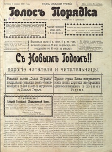 Пятница 1 январи 1910 года. ГОД Ъ ИЗДАНІЯ т р е т і й . Цѣ на номера 5 копѣ екъ. №1 ♦ Выходнп.: ІЮ Воскресеньямъ, Вторникамъ, Четвергамъ п Субботамъ. Редак ція: Орловская ^ улица, домъ 4 б. К а л а б и н о й , т ♦ Задачи газеты: Царь Самодержавный. Государственная Дума. Россія единая и недѣ лимая. Мирное правовое "іГ развитіе государства на основѣ родной исторіи и на- А родныхъ особенностей русскаго уклада жизни Т Гачета ^Голоса. ІІорядка“ лъ 1910 году будеті.. по преимуществу, обслу- ж-пваті. мѣ стные питересы. Главное вниманіе будеп. обраиісно па мѣ >стную, городскую и .чемскую жікшь п ихч. акопо.мтескія нужды. Кч. вопросамъ иашеіі внутренней политической жіі.чпп, гааета, по прежнему будеть "V относиться безъ ненависти и вражды, не отступая при нтомъ отъ защиты національныхъ ннтересовч.. По зоскресеньямъ фельетоны И. А. Иванюшенкова. ♦ ♦ ♦ ♦ ІІодппска на газету прпппмается: іп. ТІІІЮГРА- <І>ІИ ГАЗЕТЫ, и конторѣ И. А. Ивапюшепкоіш. Редакторъ-Издатель I . Евсигііѣ евъ. ♦ ♦ ♦ ПЛАТА ЗА ОБЪЯВЛЕНІЯ: за строку петита, впереди т. ш. въ \ сг. ‘20 коп., позади т. ш. въ ' ^ ст. ] 0 коп. Позади текста для лицъ ищущихъ труда 'за 5 ст. 20 коп. Объявленія годовыя, полугодовыя и мѣ сячныя по соглашенію. Подпасная ціьна 4 р. аног. 5 р. въ годъ, (пеньшіе сроки по 50 коп. за ( к і іьсяц ъ , ано- городнаіУіъ по 60 коп. за (піьсяцъ. ^ Къ свѣ дѣ нію гг. сотрудниковъ. А Всѣ статьи для помѣ щенія въ газетЬ ^ должны быть доставлены за подписью 2 II съ адресомъ автора, безъ чего онѣ пе- 9 чатаемы не будутъ. ^ Рукописи обратно не возвращаются. ё РЕДАІѵ ТОРЪ ПРИНИМАЕТЪ ИО ДЪЛУ въ Ч конторѣ типографіи въ присутственные дин 9 отъ 3—4 часовъ дня. Ходомъ!! дорогіе читатели и читательницы. Редакція газеты „Голосъ Порлдка“ поздравляетъ редакціи вс ѣ хъ обмѣ ни вающихся съ ней газетъ и журналовъ съ Новымъ Годомъ. 7- і. Правые города Ельца поздравляютъ ВСѢ ХЪ своихъ дорогихъ иногороднихъ единомышленниковъ съ Н о в ы м ъ Г о д о м ъ . О Б Ъ Я В Л Е Н І Е . ^ Елецкій Городской Общественный Банкъ объявляоті.. что с'Ь I января 1910 года Гіаіікъ будсгь взп.мать ІЮ ссудамь іюд'ь залоги І’осударствсипыхь и частпых'ь процент ныхъ бумагь II по спеціальнымъ текуіци.мь счетамь. обезпечен- ііым'ь Процентными бумаіами вмѣ сто семи по ш е с т и нроцеитовь на сто ВТ. годъ. -1 Днііекторт. Н. А. Ростовцевъ. Бухгалтерт. П. Поваляевъ. Слецъ 1 лнЬаря. Вступая ВТ. третій годъ своего существованія, моікемт. сказать, что задачи ііаііиі оста.тисі. одн ѣ и тѣ же. Все что служить воз рожденію и укрі'.п.тенію ВТ. пасъ чувствъ здоровыхъ націонализма иі патріотизма, все что слуяиттт. кт. ^ '^Ч(риомц развитію нашей родины, осе что слуяиітт. къ ея благу, бу- летт. находить вт. наст. го])ячііхъ защитниковъ и сторонниковъ. Б у дучи газетой небольшой и провіпі- ціалыюй, газета но молчстт. отда вать свои страішцьі псецѣ .то вопро самъ такъ иазывас.мон большой ио- .титнки. Паша задача сдѣ лать м ѣ стную газету вполнѣ мѣ стной и необходн.моГі обывателю. Для итого уячС ст. декабря ііроиі.таго года приглашены вт. сотііуднпкіі мѣ ст ные дѣ ятели и образованъ редак ціонный ко.мнтстт.. для того чтобы остав.'іяя за собой общее руковод ство газетой, редакція могла бы ВІЮ.ТНІ’. испо.тьзовать въ мѣ стной га зетѣ мѣ стныя силы. Въ настоящее вре.мя въ І’оссін, иовсе.мѣ стно, осо бенно интересуются іі вт. правой и въ лѣ вой прессѣ восшіы.мъ и мор- скнмт. вопросами, особенно іюслѣ д- іінмь. Однн.м’ь пзТ) лучшнхт. знато-