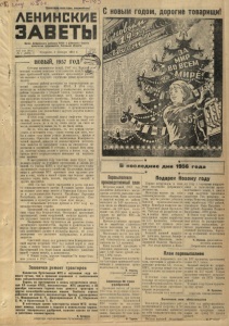 Пролетарии всех стран, соединяйтесь! ЛЕНИНСКИЕ ЗА В ЕТЫ Орган Добровского райкома КПСС и районного Совета депутатов трудящихся, Липецкой области Год ияд. 28-й № 1 (2403) В торник, 1 января 1957 г . Цена 15 коп. новый, 1 9 5 7 Г О Д Сегодня начинается новый, 1957 год. Каждый со ветский человек невольно оглядывается н а з а Х < ^ Ш ^ . вает пройденный путь, оценивает проделанную раооТ^, заглядывает в будущее, определяя новые практические задачи. Большая работа проведена по осуществлению ре шений двадцатого съезда КПСС. Б 1956 году, несмотря на неблагоприятные условия погоды, колхозы района Справились с уборкой хлебов, досрочно выпол нили планы по хлебозаготовкам, мясу, молоку и дру гим продуктам сельского хозяйства,- повысилась про дуктивность животноводства. Больше, чем в предыду щем году произведено продуктов сельского хозяйства. Созданы материально-технические и организационные предпосылки для дальнейшего крутого подъема колхоз ного производства. В 1956 году советский народ энергично боролся за мир, против войны. За мир не только на своей соб ственной земле, но и. за то, чтобы нигде на свете не могла возникнуть какая бы то ни была война. Но то, чего мы добились, то, что сумели осуще ствить в истекшем году,—лишь основа для того, что бы в новом году наши успехи развивались, крепли и множились. Советские люди, воспитанные Коммунисти ческой партиен, никогда не довольствуются достигну тым, никогда не закрывают' глаза на имеющиеся не достатки и упущения. II сегодня, в первый День янва ря, намечая планы жизни и работы в новом году, мы прежде всего сосредоточиваем внимание на нерешен ных задачах. В наступившем году советские люди будут про должать борьбу за успешное претворение в ' жизнь ре шений XX съезда КГтСС в деле крутого подъема социа листического сельского хозяйства. Колхозники, колхоз ницы и работники МТС приложат свои трудовые уси лия к тому, чтобы в нашей стране еще больше произ водилось зерна, мяса, молока, картофеля, овощей и других продуктов. 1956 год был годом укрепления и роста сил все го социалистического лагеря. В едином лагере борцов за великое дело мира вместе с Советским Союзом твер до и последовательно борются Китайская ' Народная Республика, все страны народной демократии. Рост экономики и культуры этих стран идет вперед. С печальными итогами пришли к 1957 году ка питалистические страны. Прошедший год для трудящихся канитадистиче: ских стран был безрадостным. Обострение внутренних противоречии, гонка вооружений, военные налоги—все это ухудшает тяжелое положение трудящихся. Направляя силы трудящихся на развитие социа листического производства, партия и правительство и впредь будут проявлять неослабную заботу о повыше нии жизненного уровня и культуры народа, об удов летворении его растущих материальных и деловых запросов. Советский народ под руководством Коммунистиче ской партии встречает 1957 год полной верой в свои силы, в победу своего правого п справедливого дела. Наступающий год будет годом дальнейшего движения нашей страны вперед, к коммунизму'. С Новым годом, дорогие товарищи! За новые боль шие успехи в 1957 году! С новым годом, дорогие товарищи! Закончен ремонт тракторов Коллектив Путятинской МТС в истекшем году на много лучше, чем в прошлом справился о выполнением всех сельскохозяйственных работ. Борясь за претворение в жизнь историче