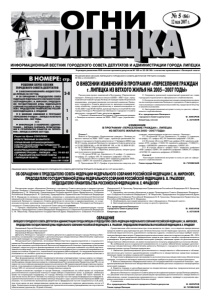 № 5 ( 86 ) 12 мая 2007 г. ИНФОРМАЦИОННЫЙ ВЕСТНИК ГОРОДСКОГО СОВЕТА ДЕПУТАТОВ И АДМИНИСТРАЦИИ ГОРОДА ЛИПЕЦКА Учрежден решением XVII сессии горсовета депутатов № 189 от 30.06.98 г. в качестве приложения к «Липецкой газете» РЕШЕНИЯ XXVIII СЕССИИ ГОРОДСКОГО СОВЕТА ДЕПУТАТОВ О внесении изменений в «Бюджет гОрО- да Липецка на 2007 гОд» 2-8 ОБ ОБраЩении к председатеЛю сОвета ФедерацииФедераЛьнОгО сОБраниЯ рОссий- скОйФедерации с. м. мирОнОвУ, председате- Лю гОсУдарственнОй дУмЫ ФедераЛьнОгО сОБраниЯ рОссийскОй Федерации Б. в. грЫз- ЛОвУ, председатеЛю правитеЛьства рОссий- скОй Федерации м. е. ФрадкОвУ 1 О внесении изменений в прОграммУ «пересеЛение граждан г. Липецка из ветхОгО жиЛьЯ на 2005—2007 гОдЫ» 1 Х Х Х инФОрмациЯ О намерениЯх админис- трации г. Липецка разрешить прОектирОва- ние и стрОитеЛьствО ОБъектОв на территО- рии г. Липецка в апреЛе 2007 гОда. 8 l l l l в нОмере: стр. Редактор Ирина СОКОЛОВА ОТВЕТСТВЕННЫЕ ЗА ВЫПУСК: УПРАВЛЕНИЕ ОРГАНИЗАЦИОННО- КОНТРОЛЬНОЙ РАБОТЫ ГОРОДСКОГО СОВЕТА ДЕПУТАТОВ тел. 77-56-51 ИНФОРМАЦИОННОЕ УПРАВЛЕНИЕ АДМИНИСТРАЦИИ г. ЛИПЕЦКА тел. 74-65-62 ГУ «РЕДАКЦИЯ ОБЛАСТНОЙ ГАЗЕТЫ «ЛИПЕЦКАЯ ГАЗЕТА» тел. 33-00-69 Заказ № 11836 Статья 1 Внести в Программу «Переселение граждан г. Липецка из ветхого жилья на 2005—2007 годы», принятую решением Ли- пецкого городского Совета депутатов от 17 февраля 2004 года № 411 (в ред. решенийЛипецкого городскогоСовета депутатов от 21.06.2005№66, от 20.09.2005№130, от 28.12.2005№227, от 18.07.2006 № 379) следующие изменения: 1. Приложение № 1 «Перечень жилых домов, непригодных для постоянного проживания»: 1.1. В строке № 66 «ул. Одоевского, 2» цифру «1» заменить на цифру «2»; цифры «65,19» заменить цифрами «130,38». 1.2. В строке «итого» цифры «657» заменить цифрами «658»; цифры «32591,18» заменить цифрами «32656,37». 2. Приложение № 2 «график строительства квартир для граждан, переселяемых из ветхого жилья г. Липецка»: 2.1. В строке № 70 «ул. Одоевского, 2» цифру «1» заменить на цифру «2»; цифры «65,19» заменить цифрами «130,38». 2.2. Встроке «итогоза 2007 год» цифры«218» заменитьциф- рами «219»; цифры «11243,12» заменить цифрами «11308,31»; цифры «148386,65» заменить цифрами «149247,03». 2.3. В строке «Всего» цифры «657» заменить цифрами «658»; цифры «32591,18» заменить цифрами «32656,37»; цифры «414788,12» заменить цифрами «415648,5». Статья Настоящие изменения вступают в силу со дня их офици- ального опубликования. Глава города Липецка М. ГУЛЕВСКИЙ РешеНие XXVIII СеССии ЛиПецкОгО гОРОдСкОгО СОВета деПУтатОВ тРетьегО СОзыВа № 564 от 24.04.2007 г. О внесении изменений в прОграммУ «пересеЛение граждан г. Липецка из ветхОгО жиЛьЯ на 2005—2007 гОдЫ» Рассмотрев проект изменений в Программу «Переселение граждан г. Липецка из ветхого жилья на 2005—2007 года», пред- ставленный главой города Липецка в порядке правотворческой инициативы, учитывая решение постоянной комиссии Липец- кого городского Совета депутатов по жилищно-коммуналь- ному хозяйству, градостроительству и землепользованию от 12.04.2007 года№86-02/04, руководствуясь статьей 20 Устава города Липецка и Регламентом Липецкого городского Совета депутатов, городской Совет депутатов решил: 1. Принять «изменения в Программу «Переселение граждан г. Липецка из ветхого жилья на 2005—2007 года» (прилагают- ся). 2. Направить указанный нормативный правовой акт главе города для подписания и официального опубликования. 3. контроль за исполнениемнастоящегорешения возложить на постоянную комиссиюЛипецкого гор