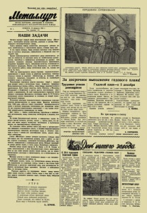 Пролетарии всех стран, соединяйтесь! О Р ГАН ПАРТКОМ А , Д И Р Е К Ц И И И 'ЗАВ КОМ А Н О В О Л И П Е Ц КО ГО М Е Т А Л Л У Р ГИ Ч Е С КО ГО ЗАВОДА СУББОТА, 16 февраля 1952 г. Год издания 1-й Н А Ш И З А Д А Ч И Сегодня выходит первый номер многотиражной газеты «Метал лург», являющейся органом парткома, дирекции и завкома Ново липецкого металлургического завода. Газета призвана помочь коллективу металлургов успешно ре шать хозяйственные и политические задачи, стоящие перед ним. А эти задачи огромны. Завод успешно выполнил план прошлого года по вы пуску продукции, перевыполнен и январский план ны нешнего года. Однако производственные возможности цехов используются да леко не полностью. В некоторых цехах их хозяйственные руково дители, партийные и профсоюзные организации не уделяют еще должного внимания вопросам. социалистического соревнования, внедрению передового опыта, повышению качества и снижению се бестоимости продукции. Именно этим объясняется, что качествен ные показатели работы завода значительно ниже тех, какими они могли бы быть. 1952 год характеризуется новым подъемом социалистического соревнования в нашей стране за досрочное выполнение производ ственных планов по заданной номенклатуре, за снижение себе стоимости продукции, повышение ее качества, за строжайшую экономию сырья и материалов. Неиссякаемая творческая энергия советских людей с каждым днем рождает новое в организации труда, выдвигает передовые, болецюовершенные приемы работы, новые формы социалистического соревнования. Всей стране известны имена Левченко и Муханова, Жандаровой и Агафоновой и многих других, выступивших нова торами в соревновании. Во всей промышленности подхвачен почин молодых стахановцев Московского автозавода имени И. В. Сталина, положивших начало соревнования за экономию на каждой произ водственной операции. Начинания новаторов социалистического соревнования получают широкое распространение на нашем заводе. Досрочно выполнить план 1952 ^ода, добиться нового повышения производительности труда и выпуска продукции, использовать все внутренние резер вы для создания сверхплановых накоплений — под такими лозун гами развертывается соревнование на заводе. Долг газеты — помочь хозяйственным, партийным и профсоюз ным организациям, всему коллективу металлургов в решении этих задач. На основе большевистской критики и самокритики нужно бо роться против' косности, рутины, застоя — против всего, что ме шает или может мешать коллективу металлургов в выполнении данных им производственных обязательств. На страницах газеты должны найти свое место и распростране ние передового стахановского опыта, и вопросы совершенствования технологических процессов, организации труда, и вопросы' куль туры и быта — словом вся многообразная жизнь нашего завод ского коллектива. Газета «Металлург» сможет успешно выполнять стоящие перед ней задачи при том непременном условии, если в работе ее при мут участие стахановцы, инженерно-технические работники, пар тийный, профсоюзный и комсомольский актив. Каждый трудящий ся завода должен видеть в газете своего ближайшего помощника. Великие вожди нашей партии В. И. Ленин и И. В. Сталин в своих высказываниях о роли большевистской печати характеризог вали ее к а к самое мощное оружие нашей партии, ка к не только коллективного 