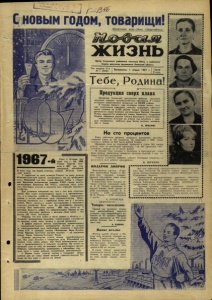 Сновым годом, ПРОЛЕТАРИИ ВСЕХ СТРАН, СОЕДИНЯЙТЕСЬ! жизнь Орган Усманского районного комитета КПСС и районного ______ Совета депутатов трудящихся Липецкой области Год мдання^^37-й | Воскресенье, 1 января 1967 г. Цена 2 коп. Тебе, Родина! #'-о-о-о-о-о-с«ьо-ок>-(Ы><>^ Продукция сверх плана Коллектив Усманскои махорочной фабрики досрочно выполнил год о вую производственную про грамм у . К 1 января выпущено сверхплановой пр о д у кц и и на 320.000 рублей. В течение перво го года пятилетки освоен выпуск сига рет, значительно повышено качество продукции , себестои мость снижена на 25.000 рублей . Самую вы со кую прои зво дительность труда показали ре гулировщ и к Василий Иванович Попову, машинистка резальных машин Валентина Андреевна Перова, сборщ ица ящиков Татьяна Васильевна Символокова. М ахорочни ки вступают во второй год пятилетки с твер дым намерением добиться еще более высоких показате лей в труде. П. КРАСКИН . >-о-о-о-о-о-о-о-о-<у 1967 Ушел в историю еще один год — год 1966. Страна Советов всту пила в 1967 год. Год необычный, юоилеиныи. В этом году мы будем отмечать славное 50-летие Совет ской власти. С гордостью за свою великую Родину, за нашу родную Коммунистическую партию оглядываемся мы на пройденный путь. Минувший год был годом больших побед и сверше ний. Выполняя исторические решения XXIII съезда партии, последующих Пленумов ЦК КПСС, советские люди доби лись блестящих успехов в развитии всех отраслей народного хозяйства. Для усманцев минувший год, как и для всех советских людей, был годом плодотворного труда и в промышленно сти, и в сельском хозяйстве. Промышленные предприятия района с честью выполнили свои социалистические обяза тельства, закончили год с прибылью более чем в I миллион рублей. Могут гордиться своими достижениями и труженики сельского хозяйства. Взять хотя бы урожайность зерновых культур. Она повысилась против 1965 года почти иа 3 Центнера. Кажется, цифра эта незначительная. Однако из нее сложилась ощутимая прибавка в валовом сборе зерна — без малого 100 тысяч центнеров! Отрадно, что наш район в числе первых в области и с большим превышением выполнил планы-заказы государства по продаже хлеба, мяса, молока и другой продукции. В районе выросло немало передовиков промышленного и сельскохозяйственного производства. Лучшие из лучших за самоотверженный труд награждены орденами и медалями Ц Союза ССР. А свинарка совхоза «Коммунар» Нина Кузьми нична Нартова удостоена высшей награды — ей присвоено знание Героя Социалистического Труда. Отмечая достигнутые успехи, нельзя самообольщаться ими. Нас ждут большие и интересные дела. Юбилейный год должен стать годом новых, еще более замечательных успе хов в промышленности и сельском хозяйстве. Но успехи не приходят сами по себе, по желанию, они достигаются трудом. Работать самоотверженно, вдохновенно в юбилейном году дело чести и славы рабочих, колхозников, интеллигенции. С Новым годом, дорогие друзья и товарищи! Новых успехов вам во славу нашей великой социалистической Ро дины, во имя мира и счастья на Земле! На сто процентов Вчера мебельная фабрика завершила выполнение производ ственного плана на 100 процентов. По сравнению с 1965 годом Быпущ(ко мебели на 650 тысяч рублей больше. Выполнен план по получению прибылей в сумме 244 тысячи рублей, план по реализации продукции — на 105 процентов, себе стоимость снижена н