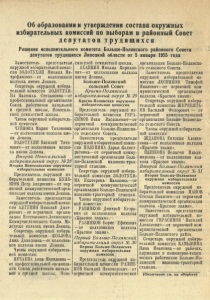 Об образовании и утверждении состава окружных избирательных комиссий по выборам в районный Совет д е п у т а т о в т р у д я щ и х с я Р еш ени е исполнительного комитета Больше-Полянского районного Совета депутатов трудящихся Липецкой области от 5 января 1955 года З ам е с т и т е л ь п р е д с е д а т е л я окруж ной избирательной комис сии ЗОЛОТУХИН М ихаил Ми тр оф ан о ви ч—от колхозн иков к о л х о за имени Л ени н а. С екретарь окружной и зб и р а тельн ой комиссии ЗОЛОТУХИ НА Н а д еж д а С теп ан о вн а— от проф ессиональной ор ган и зац и и Союза работников начальной и средн ей ш колы , Новосиль- ско й сем и л етн ей ш колы . Члены окружной и зб и р а т е л ь ной ком и сси и : ЧУЙКОВА М ария Тихоновна 1 — от колхозн иков к о л х о за име ни Л ени н а. ЗОЛОТУХИН В асилий Т и х о нович— от колхозников ко лхо з а имени Л ени н а. Второй. Новосильский избирательный округ №28 Вторая Новосильская окружная избирательная комиссия П р ед сед ател ь окруж ной и з бир ател ьн ой комиссии КУЛЕ ШОВ Петр А н д р е е в и ч -о т пер вичной комм унистической о р г а н и зац и и к о л х о за имени Л ени н а. З а м е с т и т е л ь п р е д с е д а т е л я окруж ной и зб ир ател ьной комис сии АЛТУНИН Николай Д м и т р и е в и ч ''-о т первичной о р ган и за ц и и Всесою зного Л ени н ского К омм уни стического Союза Мо ло д еж и к о л х о за имени Л енина. С екретарь окруж ной пзбпра тельн ой комиссии КОЗЛОВА Анна Д ан и л о вн а— от ко л х о зн и ко в к о л х о за имени Л ени н а. Члены окруж ной и зб и р ат ел ь ной комиссии: НЕЧАЕВА Анна Я к о в л е в н а— от проф ессиональной о р г а н и з а ции Сою за работников н а ч а л ь ной И Средней ШКОЛЫ, Ново- с и лю к о й сем и л етн ей ш колы . АХАПКИН М ихаил К ири лло вич— от ко л х о зн и ко в к о л х о за имени Л ени н а. Больше-Полянский сельский Совет Красно-Полянский избирательный округ № 29 Красно-Полянская окружная избирательная комиссия П р ед сед ател ь окруж ной и з б и рательн ой комиссии ГЕ РА СИМОВ И ван В аси л ьев и ч— от первичной комм унистической ' о р ган и зац и и Б ол ьш е-П о л ян ско го сел ьск о го С овета. З ам е с т и т е л ь п р е д с е д а т е л я окруж ной и зб и р ател ьн ой ком и с сии ПОЛУНИНА Д ар ья К олист- р а т о в н а— от первичной комм у н и сти ческой о р га н и за ц и и Боль- ш е-Н олянской м ашинно т р а к торной ст ан ц и и . С екретарь окруж ной и зб и р а тельн ой коми ссии ЗОЛОТУХИ НА Е к а т е р и н а П ав л о вн а— от первичной комм унистической о р ган и зац и и Больш е-П олян ской м аш инно-тракторной с т а н ц и и . Члены окруж ной и зб и р а т е л ь ной ком и ссии: РАЗИНКОВ Дмитрий Е го р о вич от колхозн и ков к о л х о за «К расное зн ам я » . РАЗИНКОВ Борйс Ефимович — от ко л х о зн и ко в к о л х о за «Красное зн ам я » . Первый Больше-Полянский избирательный округ № 30 Первая Больше-Полянская окружная избирательная комиссия П р е д с е д а т е л ь окруж ной и з б и р ател ьн ой комиссии РАЗИН КОВ В асилий Яиконорович— от | первичной комм ун исти ческой I о р га н и за ц и и Б о л ьш е-П о л ян ск о го с е л ь с к о го С овета. З а м е с т и т е л ь п р е д с е д а т е л я окруж ной и зб и р ател ьн ой к о м и ссии ЛЕСНИКОВ Тимоф ей И ванович— от первичной ком м ун и сти ч еской о р га н и за ц и и к о л х о за «К расное зн ам я » . С екретарь окруж ной и зб и р а тельн ой ком и ссии Ж Е Р Е Б Я Т Ь - ЕВ В аси л и й Ф едорович — от первичной комм ун исти ческой о р га н и за ц и и Б ольш е П о л я н с к о го с е л ь с к о го С овета. Члены окруж н