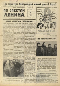 '■1».-|*'|»||4||4||4!|41|4||4||1||4|<4||4|;4и4||4"4||«||*н4н4'||4|<»м4-.1&м*||+'1г|♦!>«►»*4Н4Л4п4д4п4>4||4н4|14||4п%1.4«|4||4||4.|4||4и4Й^й4»^1»4|Ли*и41|4гЛн4.|4.А|!4||4||^и4||4|»4||ША»4ч4|14|)411*;1ч|«и»а»'11»||4||4(|41|4||%114Ь«1|4к ЛМ ( ЗгмоимЯ) п*11»чЬ||411»|1%:чк»*>'*»!|*и4н*п4и*и»1|4п*и*!1>11*.г^.г*1♦ч4м*м4'|*||4п4и< Да здравствует Международный женский день—8 Марта! • 4 ||» 1 <« 1 | 4 | 1 * 141 « 1 *|| 4 ||* 1 «|| 4 ||« 1 «||*||«)|»||*||«и*"* Пролетарии всех стран, соединяйтесь! П О З Я В Е Т Я М Орган В олынского райкома К П С С и районного Совета депутатов трудящихся, Липецкой области Год изд. 30-й № 29 (3150) Среда 8 МАРТА 1961 г. Цена 2 коп. СЛАВАСОВЕТСКИМ ЖЕНЩИНАМ! 8 марта женщины всего ми ра в 51 раз будут отмечать свой трудовой праздник—Меж дународный женский день. За годы Советской власти выросло новое поколение жен щин. Духовной красотой, их мужеством и волей, предан ностью делу коммунизма гордится наш народ и тру дящиеся всего мира. Следуя заветам Ленина, со ветские патриотки являются активными участниками в стро ительстве коммунизма. Про- «в 1 ин неиссякаемую инициа тиву, трудовой героизм и раз носторонние дарования, совет ские женщины самоотверженно трудятся во всех областях хо зяйственной, государственной, культурной и общественно-по литической жизни. Женщины составляют 70 процентов об щего числа врачей в стране, 70 процентов учителей, более полумиллиона женщин—инже неров и техников. Велик подвиг женщины в развитии социалистического сельского хозяйства нашей страны. Женщины ныне составляют в колхозах 58 процентов. Де сятки тысяч женщин возглав ляют ответственные участки сельскохозяйственного произ водства, работают механизато рами, председателями, брига дирами,заведующими животно водческими фермами, зоотехни ками, агрономами, директора ми совхозов. — ---- ★ . По призыву партии и Совет ского правительства тысячи женщин-патриоток выехали на освоение целинных и залеж ных земель и своим самоот верженным трудом снискали себе любовь и уважение со ветского народа. Партия и правительство вы соко оценивают самоотвержен ный труд советских, жещцин. Тысячи женщин удостоены звания Героя Советского Сою за и Героя Социалистического Труда. Большой вклад в дело борь бы за подъем сельского хозяй ства вносят женщины н?.шего района. Знатная доярка райо на Игнатова Т. И. надоила в прошлом году по 4000 кило граммов молока на фуражную корову. Высоких показателей в увеличении надоев молока добились доярки В.А.Чернова, М.М. Тришина, Тришина Е. Н. из колхоза имени Сталина;А.П. Демьянова из колхоза имени Лермонтова, Н.Н. Шаталова из колхоза имени Ленина, М.Д. Ко- рендюхина из Лебяженского отделения совхоза, надоившие свыше 3000 килограммов моло ка на фуражную, корову. Большую трудовую победу одержали передовики свиновод ческих ферм. Свинарка Е.Н.Не- стерова из колхоза имени Лер монтова,М.Д.Черногубова из кол хоза имени Ленина получили по 22—25 поросят от каждой свиноматки, Гурова Т. Н., -------------- звеньевая Ключинского отде ления совхоза, вырастила по 140 центнеров сахарной свек лы с гектара. Звеньевая кол хоза имени Ленина Войлокова М. Б. получила по 400 центне ров сахарной свеклы' в пере счете на гектар. Н. С. Хрущев на январском Пленуме ЦК КПСС дал высо кую оценку передовикам сель скохозяйственного производст ва, назвав их маяками,указы вающими путь к высокой про изводительности труда, при звал изучать и распространять их замечательные опыты. В борьбе за претворение в жизнь историче