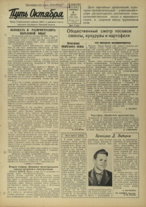 г ли\ Пролетарии всех стран, спедпи.ч •-ар С АС1НЛЯ. 1 еЫ/ ^ Г и з д а н и я 28-й 7 'ШипьОктяБш Орган Становлянекого райкома КПСС и районного Совета депутатов трудящихся Липецкой области !53 (3705) ПЯТНИЦА 4 июля 1958 года Выходит 3 раза в неделю Цена 15 коп. Долг партийных организаций, куль турно-просветительных учреждений— шире распространять достижения сель скохозяйственной науки и передового опыта в широкие массы тружеников села. У ОБОБЩАТЬ И РАСПРОСАТНРЯТЬ ^ ПЕРЕДОВОЙ ОПЫТ Постановление июньского Пленума ЦК КПСС «Об отмене обязательных поставок и натуроплаты за работы МТС, о новом порядке, ценах и условиях заготовок сельскохозяй ственных продуктов» вызвало новую волну социалистиче ского соревнования в деревне. Труженики полей и животноводства нашего района берут на себя более1 повышенные обязательства на 1958 год. Они проникнуты чувством гордости за Коммунистиче скую партию и Советское правительство, в ответ на новую заботу об укреплении колхозного строя и улучшении бла госостояния советских людей стремятся произвести больше сельскохозяйственных продуктов. За последние годы в колхозах и совхозах возросло число передовиков сельского хозяйства, отдельные колхозы резко увеличили производство продукции на 100 гектаров сельскохозяйственных угодий. Передовой дояркой в районе является Т. Шацких из колхоза имени Мичурина, надоившая с начала года свыше 2.000 килограммов молока на каждую фуражную корову. С честью выполняет взятые социалистические обя- ^ зательетва свинарка колхоза имени Калинина А. Дулебова, получившая уже 15 поросят на свиноматку. О своем опыте работы они рассказали на проведенном недавно Дне жи вотновода. Есть у нас и. лучшие производственники из числа трактористов, которые добросовестно трудятся на уходе за посевами пропашных культур. Например, в колхозе имени Свердлова любовно обрабатывают посевы кукурузы тракто ристы Д. Глухов н И. Глухов, в чистом и рыхлом состоя нии находятся посевы картофеля на площади 62 га в колхозе «17-й партсъезд», которые обрабатывал механиза тор П. Меркулов. Ряд первичных партийных организаций стремится раз нообразить формы п методы распространения опыта пе редовиков колхозного производства. Эти позволяет им до биваться успехов в решении хозяйственных задач ,. стоящих перед колхозами. К сожалению, не все партийные организации по- настоящему занимаются обобщением и распространением передового опыта. Возьмем, например, парторганизацию колхоза «Победа». Здесь одной из опытнейших доярок считается А. Воробьева. Но ее опыт работы среди других животноводов распространяется слабо. Многие агитаторы в своих беседах часто не упоминают о передовых людях. Аналогичное положение и в колхозе «Светлый путь». Здесь звено по выращиванию сахарной свеклы Валентины Артемовой первым закончило шаровку и прорывку расте ний. Однако партийная организация не сделала успех свекловичниц достоянием других. Некоторые сдвиги, происшедшие в колхозах, говорят о том, что сейчас имеются все условия для дальнейшего быстрого увеличения производства зерна, мяса, молока и другой сельскохозяйственной продукции. Долг партийных организаций, культурно-просветительных учреждений— шире распространять достижения сельскохозяйственной науки и передового опыта. Для этой цели следует исполь зовать устную и наглядную агитацию