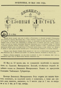 ВОСКРЕСЕНЬЕ, 29 МАЯ 1894 ГОДА. ^ ч ^ ~ _ Ф _ ; ■ - а № г.зч< 7эіш|г— гь (О:::з^з. '' . ............... о (^ ' ■' ______________ с? С I .;мі1 И 1.11! . 1 ІИ і о | ; ' | , (г * Со о) © у ' * 1 1 ж 1 @ 1 № * 1. '8)13 %Но ____________________ Липецкій Листокъ выходитъ одинъ разъ въ недѣлю, но Воскресеньямъ, но слѣду»щей программѣ: 1) Распорядитель ныя постановленія Липецкихъ Минеральныхъ Водъ, а также объявленія и медицинскія указанія, относящіяся до лѣчащих ся на курортѣ; 2) Списокъ Врачей, практикующихъ на водахъ, съ обозначеніемъ ихъ мѣста жительства, спеціальности и пріемныхъ часовъ; 3) Списокъ лицъ, пріѣзжающихъ па лѣчебный сезонъ; 4) І’осішсаніе часовъ игры оркестра музыки н другихъ развлеченій для больныхъ, назначаемыхъ Правленіемъ минеральныхъ водъ на послѣдующую недѣлю; Г») Свѣдѣнія о количествѣ отпущенныхъ мѣстныхъ лѣчебныхъ средствъ, о статистикѣ лѣчащихся и вообще о характеристикѣ крачюной дѣятельности лѣчебнаго сезона за истекшій мѣсяцъ; 6) Обозначеніе времени прихода и отхода поѣздовъ изъ Липецка и въ Липецкъ по линіи Орловско-Гряяской желѣзной дороги; 7) Метеорологическія наблюденія н 8) Частныя объявленія. Отдѣльные номера Липецкаго Сезоннаго Листка продаются но 5 коп. сер. въ лѣтней конторѣ, находящейся въ Ниж немъ минеральномъ саду, въ библіотекѣ при Курзалѣ и въ кумысномъ павильонѣ, находящемся въ Верхнемъ саду. Подписка на Листокъ принимается и на весь сезонъ съ доставкою па домъ и съ пересылкою, цѣна 1 руб. сер., подписываться можно только въ Лѣтней Конторѣ Липецкихъ минеральныхъ водъ. 25 Мая въ 12 часовъ дня, по совершеніи молебствія съ водосвя тіемъ въ Главномъ Минеральномъ Колодцѣ, послѣдовало открытіе лѣ чебнаго сезона на Липецкихъ Минеральныхъ Годахъ въ присутствіи Господина Тамбовскаго Губернатора. Контора Липецкихъ Минеральныхъ Водъ открыта для выдачи биле товъ сезонныхъ, на полученіе ваннъ и кумысныхъ, а также для вся каго рода справокъ, ежедневно, съ 0 часовъ утра до 1 час. по полуд ни и съ 5 час. до 8 час. вечера.