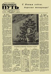 Пролетарии всех стран, соединяйтесь! Стаи ш н ш и г Газета Липецкого районного комитета Коммунистической партии Советского Союза и районного Совета депутатов труаящихс» Липецкой области № 1 (1179) ВТОРНИК, 1 января 1957 г. Год издания 16-й Цена 10 к. С Но в ым г о д о м , д о р о г и е то в ар ищи! Н а б л а г о советск ого народа Отрывной календарь день ото дня становится все тоньше, будто тает. Вот-вот нетерпеливая рука протянется к последнему листку, и пятьдесят шестой год нашего ве ка приблизится к своему рубежу. В эти прощальные мгновенья каж дый, наверное, оглядывается на зад, мысленно рисует перед собой облик пережитого года. И сразу же, точно горная вер шина, предстает перед нами глав ное событие этого года— двадца ты й съезд .Коммунистической пар тии Советского Союза. Под знаком решений съезда трудятся и созидают советские люди. Рабочие; колхозники, интелли генция не ограничиваются только своими трудовыми делами. Чувст вуя себя хозяином страны, вер шителем ее судьбы, ее будущно сти, советский человек активно участвует в общественной и поли тической жизни. Этот год отмечен широкой борь бой захлеб. Началось невиданное в истории наступление на веками лежавшие нетронутыми степи Сибири, Ка- истана, Урала, Поволжья. За ко- откий срок освоено 35,5 милли ма гектаров. .Создано 425 новых вхозов. Площадь освоенных в шей стране целинных и залеж- дй х земель почти в 1,7 раза пре вышает посевные площади зерно-, вых культур Великобритании, Италии, и Франции, вместе взя ты х. Погода в этом году не баловала. Весна запаздывала, дожди шли не вовремя. И все же урожай был собран. И какой урожай! Небыва лый, богатейший. Борьба за хлеб увенчалась великой победой. Наш народ— 'хозяин страны, и совершенно справедливо, что боль шая доля народного достояния' идет на поднятие жизненного, уровня, улучшение условий жиз ни трудящихся. В этом году, кроме Закона о го сударственных пенсиях, осу ществлен еще ряд крупнейших мероприятий, направленных на благо советских людей. Увеличе ны отпуска женщинам по бере менности п родам. Повышена за работная плата низкооплачивае мым рабочим и служащим. На два часа сокращен рабочий день перед выходными и праздничными дня ми. Ведется подготовка к переходу на семичасовой рабочий день. ...Год прошел в трудах и забо тах. Советские люди сделали не мало в борьбе за дальнейшее у к репление экономического могуще ства Родины, за повышение на родного благосостояния. Даль ясна. Заря коммунизма встает над нашей землей. Этой за ре навстречу смело и свободно идут рука об р у ку советские люди. — С Новым годом, товарищи! ПРОИЗВОДСТВЕННЫЕ ПОДАРКИ РОДИНЕ ☆ Р е г п ы и е на т ри дня На трв дня раньше срока коллектив Липецкой МТС вы полнил пметаое задание, от ремонтировав 52 трактора. В стадии ремонта находится шесть машин, нз них две вы шли из мастерской в канун нового года. Это сверхплано вая продукция. Ремонтники трудятся друж но. Постановление декабрьско го Пленума ЦЕ КПСС вдохно вило их на новые успехи. Они стараются использовать все возможности и резервы. Осо бенно отличается бригада укомплектовки Кузьмы Ива новича Сяглова. Она выпол няет по полторы— две нормы в смену. А. Д0Л0Т0В, директор МТС. С п р е в ы ш е н и е м Работники ‘ коопе р а ц и и Ж. Лесковского сельпо в 1956 году выполнили план рознич ного товарооборота на 109 процентов. ☆ А вансом Новый год колхоз «Память Ленин