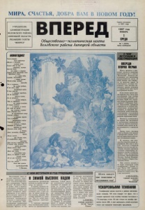 МИРА, СЧАСТЬЯ, ДОБР .. I В НОВОМ ГОДУ! УЧРЕДИТЕЛИ: АДМИНИСТРАЦИЯ ВОЛОВСКОГО РАЙОНА ЛИПЕЦКОЙ ОБЛАСТИ, РЕДАКЦИЯ ГАЗЕТЫ “ВПЕРЕД” Обгцественно—политическая газета Ъоловского района Аипецкой области Газета основана в 1931 году 1997 год ЯНВАРЬ СРЕДА № 1 (6559 ) Цена свободная НОВОГОДНЕЕ Тихая рощица. Елки пушистые Жались к высокой, челеной сосне. Только одна из них стройная, чистая Как-то была от подруг в стороне. Думала думу красавица елка: - Праздники скоро, а с ними беда. Срубят. Посыпятся с веток иголки. Махая роща, прощай навсегда. Так и случахось. Па выбор срубили, И на снегу лишь невзрачный пенек. В дом занесли, в мишуру нарядшхи. Да на верхушке зажгли огонек. Ты не печалься, лесная подруга, Что не придется у ж жить-зеленеть. В душах людских и морозы, и вьюга. Их хоть на время ты можешь согреть. Вот соберешь всех на праздничный вечер: {ххизких, родных и хороших друзей. Там и увидишь: расправятся п.хечи. Станут все разо.ы теп-хей и добрей. Выпьют за счастье. Забудут на вре.ш Думские речи, войну и Чечню, Денег нехватку, базарное бре.чя. Песни споют про Россию свою. И позабудутся наши невзгоды. Коих послах в наказание Бог. В ново-хх году, .может, время рассудит. Новая жизнь вдруг взойдет на порог. Жахь .мне тебя, новогодняя ехка, Жахь, не придет к тебе бахьше весна. Но не зря сыпятся на пах игахки, Еехи ты .хюдям бьиа так нужна. А.СОЛДАТОВ. С.Волово. Наступившая зима не застала врасплох живо тноводов производствен ного сельскохозяйствен ного кооператива "Заветы Ильича". Да иначе и быть не может, ведь к периоду стойлового содержания крупнорогатого скота мы начали готовиться забла говременно и на совесть. К ачественно произвели ремонт коровников и те лятников, своевременно наладили и отрегулирова ли все механизмы, обес печивающие нормальные условия для работы живо тноводов. Причем, на эти С ЧЕМ ВСТУПАЕМ В ГОД ГРЯДУЩИЙ И з и м о й ВЫСОКИЕ НАДОИ мероприятия руководство колхоза не жалело ни вре мени, ни средств. В период сенокоса на ши кормодобытчики в до статочном количестве за готовили сена, а чуть по зже, во время жатвы хле бов соломы, фуража. Нет особых проблем и с сило сом. Так что сытая зимо вка б)ренкам гарантиро вана. А хорошая кормовая база положите.льно сказы вается на продуктивности животных. Сейчас масте ра м аш и нно го доения получают от каждой ко ровы по четыре кило- граммма молока. Еще вы ше результаты на второй молочнотоварной ферме, где заведующая Любовь Н и к ол аевн а Коробова . Х ороших п ок а зател ей здесь добилась передовая доярка Галина Викторюв- на Семина. В настоящее время от каждой коровы закр еп л ен н ой за ней группы она получает око ло восьми килограммов молока. Большие надеж ды Галина Викторовна возлагает на период мас сового отела животных, так как именно в этот пе риод надои должны зна чительно возрасти. Хо чется быть уверенным , что в новом году наши передовики вновь пора дуют нас своими трудо выми успехами. А.ЛЕШОВА, главный экономист ПСХК "Заветы Ильича". Ш л е м н а и л у ч шие п ож е л а н и я в наступившем году! С Ч Е М В С Т У П А Ш & - грдгрщтМий ВПЕРЕДИ ВТОРАЯ ФЕРМА Много времени и вни мания уделяется развитию животноводства в совхозе "Воловский". Делается все I возможное для >'величения ; продуктивности скота. И ; наши чаяния, как говорит- I ся, не проходят даром. За ; одиннадцать месяцев ны- , нешнего года мастера ма- ; шинного доения получили I от коро