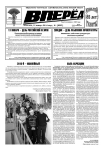 ВТОРНИК, 12 января 2016 года, №1 (9215) Газета основана в 1931 году Цена свободная 13 ЯНВАРЯ — ДЕНЬ РОССИЙСКОЙ ПЕЧАТИ Уважаемые работники и ветераны средств массовой информации! Сердечно поздравляем вас с профессиональным праздником – Днём российской печати! Трудно переоценить значимость средств массовой информации как важнейшей составляющей общественной, политической, культурной и социальной жизни нашего государства. Пресса играет огромную роль в жизни общества! Благодаря прессе мы не только узнаём новости, но и имеем возможность их анализировать, черпать полезную инфор- мацию и делиться ею с близкими и друзьями! Искренне признательны всем, кто со страниц районной газеты компетентно и бес- пристрастно освещает актуальные вопросы жизни Воловского района и области. Желаем нашим журналистам объективности, остроты пера, свежести взглядов и новизны идей! И, несмотря на бурное развитие Интернета, – роста тиражей и новых читателей! А также желаем вам неиссякаемого вдохновения, благополучия и реализации всех творческих планов! Крепкого здоровья и большого человеческого счастья вам и вашим близким! Глава администрации Воловского муниципального района С.П. БАГРОВ. Председатель Совета депутатов Воловского муниципального района В.П. АКУТИН. СЕГОДНЯ — ДЕНЬ РАБОТНИКА ПРОКУРАТУРЫ Уважаемые работники прокуратуры Воловского района! Примите самые искренние поздравления с вашим профессиональным праздником! Прокуратура — главный оплот порядка и справедливости. Она отслеживает все проблемные дела, устраняет негатив и наказывает виновных. Поэтому её представители ассоциируются с воплощением справедливости. Вы выбрали для себя очень непростой вид деятельности, но с достоинством вы- полняете возложенные на вас обязанности, ежедневно демонстрируя глубокие про- фессиональные знания. Ваш тяжёлый, ответственный труд делает мир чище и добрее. Пусть все ваши старания будут щедро вознаграждены уважением, почётом и достойной платой. Пусть в ваш профессиональный праздник наконец-то удастся отдохнуть, забыв про все рабочие трудности и заботы. Желаем вам крепкого здоровья, успехов в службе при выполнении профессио- нального и гражданского долга! Мира, любви и семейного благополучия вам и вашим близким! Глава администрации Воловского муниципального района С.П. БАГРОВ. Председатель Совета депутатов Воловского муниципального района В.П. АКУТИН. 2016-Й — ЮБИЛЕЙНЫЙ Интернет и телевидение прочно вошли в нашу жизнь. Казалось бы, газеты отодвину- лись на второй план, но большинство воловчан по-прежнему ждут выхода в свет очеред- ного номера любимого печатного издания — районной газеты «Вперёд». Печатное слово всегда в цене и почёте. От профессионализма журналиста зависит то, как вы, наши читатели, воспринимаете происходящие события. Мы стараемся быть для вас добрыми советчиками и компетент- ными собеседниками, решаем конкретные проблемы. Рассказывая о повседневной жизни селян, газета пишет историю района. Профессия журналиста особая. Чтобы издание было интересным, важен вклад каж- дого в общее дело. А значит, мы должны быть командой, которая держит руку на пульсе времени. В юбилейном году мы постараемся оправдать ваши надежды. Новые конкурсы, акции, подарки, диалоговые площадки и другие увлекательные журналистские идеи ждут чита- телей на страницах «