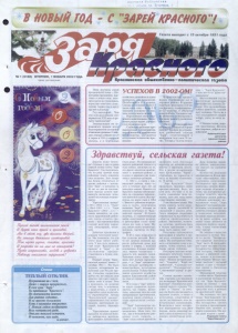 ь а у ч к ' Я с ; • ^ о ^ ! и о т е к в ■ г. .■ И’ИСШ», уд. КтГ;1.Г<>чизя, в НОВЫЙ ТОА - С "ЗАРЕЙ тСНОТО”! Г азета выходит с 15 октября 1931 года № 1 (9188 ) ВТОРНИК, 1 ЯНВАРЯ 2002 ГОДА Цена договорная Крс 1 снинскс 1 с 1 общественно -политической го зе то ТЪ ^асай (неие/П и и и и ш н а с о е ^ге к л й и ^це/& н е л к а ле гк о й и к /и г с и в о й . и О л в Э 1 н 01 а го ^ , ^ в е /н ы с я ч и в!нО [ю й, Н а лош ае^и бъезмсаем . злал*и>г 1 ги й о й . 7 /й и с ш ^а н ь ^/^а^^а , с н а а п ь е , к !га сй /н а и [га ^ о а п ь н и н а м и г н е п о ки е /аю 1 н ! Л л^а п ь и а ф е н н о а н ь , м о ^о й ь и <^о 6 (и ) 1 а а Л й й сю ^ц н е и зм е н н о ок 1 гцж аК) 1 н ! С тихи т е п л ы й о т к л и к Несравнима ни с чем, Даже с миром прекрасного, В свое имя "Заря " Ты прибавила "Красного ". По значимости важное Для района событие, И не просто бумажное Есть в названьи открытие. С Новым годом поздравить Всех читателей рада. Отклик теплый оставит, И напишет, как надо. В.КОРНЕТ. Зима достигла своей праздничной точки —Но вогодних праздников. Заж глись в домах елки, весе лятся дети на утренниках, взрослые отмечают ново годние торжества в кругу друзей и родных. Год минувший... Чем стал для краснинцев этот первый год XXI века и тре тьего тысячелетия? Земледельцам он за помнился прежде всего благоприятной погодой и отменным урожаем. С каж дого гектара собрано по 25 ц зерна и 330 ц сахарной свеклы, а в передовых УСПЕХОВ В 2002-ОМ1 хозяйствахурожайность вдвое превысила эти показатели. Позаботились и о кормах. Сенажа заготовлено более 14 тысяч тонн, сена —более 5. В траншеи заложено 31 тыс. тонн кукурузного силоса. Наращивают свои пока затели и животноюды. Посте пенно растут надои, улучша ется племенное дело. Стабильно работают про мышленные предприятия, наращиваются показатели производства, улучшается ассортимент и качество про дукции. В прошлом году продол жалась газификация сел и деревень района. В течение года было проложено 23,6 км газопровода, газифицирова но 225 квартир, 11 объектов соцкультбыта. Уделялось так же внимание капитальному и текущему ремонту различных объектов. Много публикаций под рубрикой "Пишем историю района" прошло на страни цах р ай о н н о й газеты "Заря", отметитившей в минувшем году свое 70-ле- тие. Теперь у газеты новое имя — "Заря Красного", с чем мы ее от души по здравляем! Наступивший год по восточному календарю проходит под знаком Ло шади. Это трудолюбивое доброе животное, давний друг человека. Пусть же и этот год принесет людям добро, удачу во всех де лах. С Новым годом, доро гие краснинцы! Желаем вам здоровья, добра и спо койствия! Районный Совет депутатов Администрация района [ Здравствуй, сельская газета^ 1 Дорогие наши читате ли! Сегодня у вас в руках первый номер газеты "Заря Красного". Так получилось, что по ряду причин наша районная газета изменила свое название. Зато теперь мы будем отличаться от других районок с логоти пом "Заря", к которому за 36 лет со дня ее постоян ного выхода успели при выкнуть несколько поко лений постоянных подпис чиков. "Краснинская правда" (1931-1962 г.г.), "Заря" (1964-2001 г.г.), "Заря Красного" (2002-...г.г.) — имена меняются, но сущ ность краснинской район ной. газеты остается пре жней —мы стремимся бьпь газетой воистину народ ной, популярной, читае мой. Добиться признания и доверия читетелей нелег ко. Мы понимаем, что для этого надо много рабо тать. У нас есть уникаль ный опыт "Краснинской правды" и "Зари" — на достижения предше ственников и